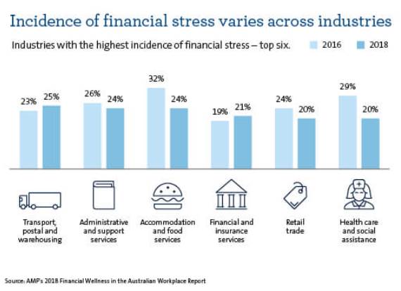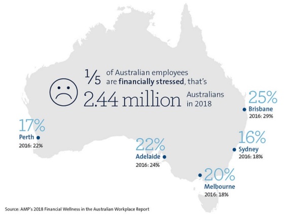 The number of Aussie employees feeling financially stressed across the board in 2018 was 19%, down from 22% in 2016.