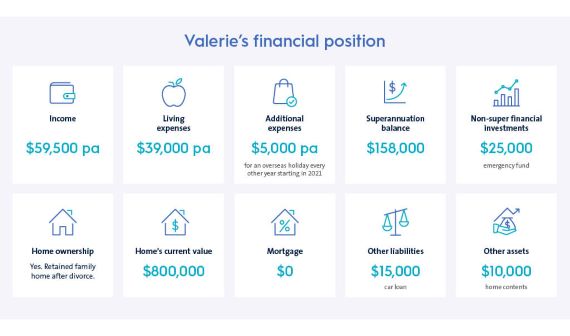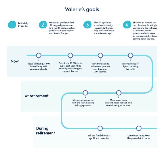 Together they define Valerie’s goals. Once Valerie’s clear on what she wants now, and in retirement, her adviser works out a tailored roadmap on how she might be able to achieve those goals.