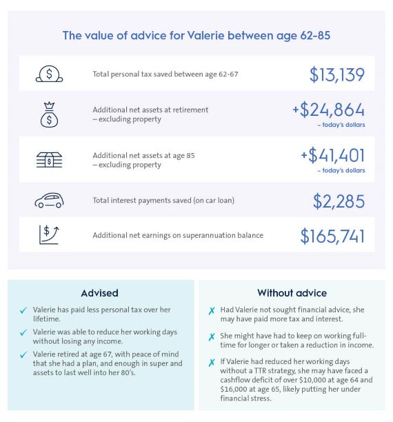 To see how financial advice can help, read Valerie’s2 story. With retirement on the horizon, she wants to start winding down her work but is worried she might not have enough in her super savings to last.