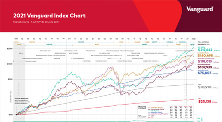 The 2021 Vanguard Index Chart below shows the performance of six different asset types over the last 30 years since 30 June 1991.