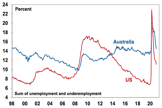 Focussing back to the current cyclical recovery – bond yields could still go a lot higher in the short term before they settle down again and this could cause the long overdue correction in equities. But the big cyclical backdrop of still low underlying inflation and spare capacity in jobs markets – see the next chart – combined with economic and profit recovery and low interest rates is a positive one for growth assets, particularly shares, and this includes Australian shares.
