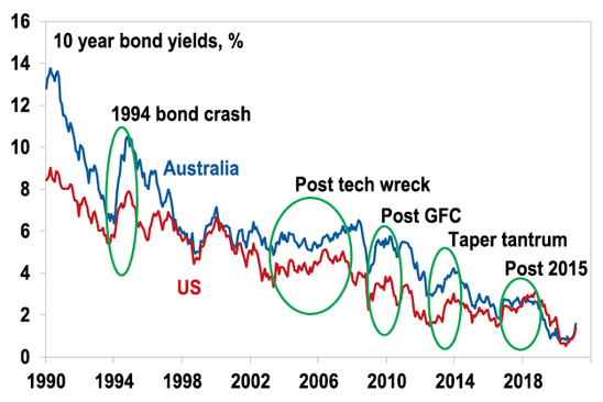 This occurs because investors switch out of safe haven bonds to invest in growth assets like shares, borrowing increases and saving declines. The next chart shows US and Australian 10 year bond yields since 1990 and highlights several moves higher – in 1994 after the early 1990s recession, in the mid-2000s after the tech wreck, after the GFC, in 2013 after the 2011-12 growth slowdown (the “taper tantrum”) and after the 2015 global growth scare. These increases have ranged from 1.5% to 4.3% (in 1994 in Australia). The latest move is not unusual historically, although it has been very rapid this year.
