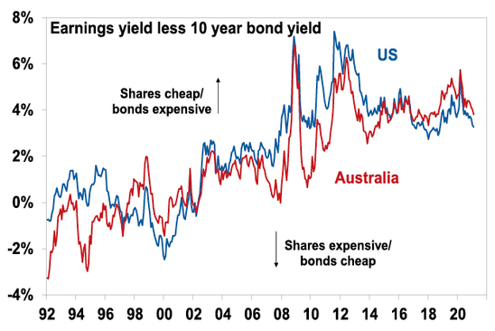 Second, rising bond yields are not necessarily a problem for shares if its matched by a rise in earnings Generally speaking, lower bond yields are good for shares because they make shares more attractive (and justify higher price to earnings ratios) and vice versa for higher bond yields which make shares less attractive, but it’s never quite that simple as it depends on what happens to company profits. For example, the plunge in bond yields a year ago saw share markets initially collapse through late February and March as earnings expectations also fell.