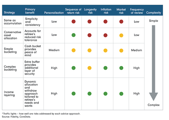 There is a spectrum of retirement investment strategies Australians can pursue which range, at its most simple, from a ‘business as usual’ approach to a significantly more complex approach, ‘income layering’. The spectrum of strategies allows for varying degrees of personalisation, and not all of them address all of the risks investors face in retirement. Table 1 compares features of each of the most common approaches used by advisers for retirement strategies and how well each approach deals with the primary risks.