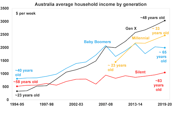 The Australian Bureau of Statistics gives data on annual household income and wealth through time. Using this data, we have looked at household income and wealth by generation (based on the midpoint of their year of birth). The next chart looks at average household income by generation, through time. It is self-explanatory that incomes increase with age, with the fastest pace of income growth from when people reach their mid-30s into their early 50s in line with career progression before flattening out into older age as households retire and drawn down on the government aged pension and/or their superannuation savings to subsidise spending. Gen X incomes started exceeding the Baby Boomers from 2008, as Gen X households enter the peak point of their career and experience higher incomes. Millennial incomes now also exceed Baby Boomers and will exceed Gen X in under a decade when Millennials reach middle age.