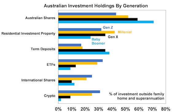 Every generation faces its own challenges. However, the economic environment can make significant differences to income, savings, retirement and therefore lifestyle. Despite the negatives on the wealth front, the young generations are entering the labour market at a time when conditions are tight (which should mean easier access to work although the youth unemployment rate has been rising in Australia) and flexible work means more job opportunities. High wages growth also means that starting incomes for young people are attractive. The younger generation also has a better ability and accessibility to invest in a broad range of assets and seems to be taking on riskier investments. The chart below shows that Gen Z are much more likely to hold riskier investments of cryptocurrencies, international shares and exchange traded funds (or ETFs) compared to older households. This allows for large potential upside but also more downside if things go wrong. The greater risk tolerance of Gen Z reflects the more secure and materially comfortable economic environment they have grown up in.