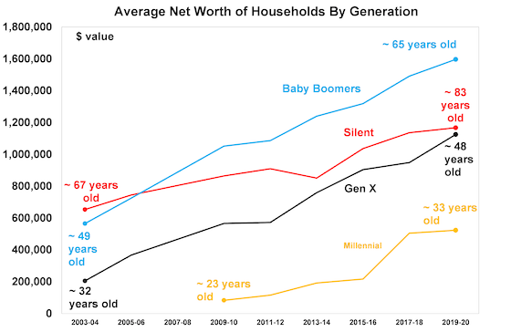 Like income, household wealth also increases through time. The chart below looks at average household net worth by generation. Each generation has enjoyed an increase in wealth over time (allowing for the fact that the data only goes back to 2003 so it’s hard to see the starting point for the Silent and Boomer generations). But the growth in Boomers’ wealth has been arguably better compared to other generations, which has lifted the ratio of the wealth gap between the older and younger generations.