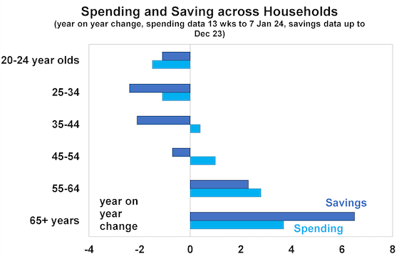 The chart below from the Commonwealth Bank’s profit result earlier this year demonstrates this divide. It looks at the difference in savings and spending across the various household groups. It shows that savings for younger households (those aged under 45) have fallen relative to a year ago and spending growth has also been low. In contrast, older households (those aged over 45) have been increasing their savings and spending (which makes sense with high savings rates available thanks to interest rate hikes) indicating little impact flowing to those groups from rising interest rates. This divergence in spending and savings across the different ages reflects the fall in disposable income for younger households paying off mortgages as a result of higher interest rates.