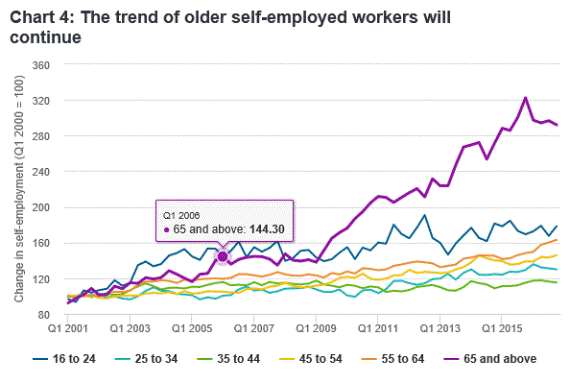The nature of work is evolving. Technology has enabled the gig economy to flourish. The pattern of on-demand work that allows employees to choose when and how much to work to perform with little pre-commitment suits many older workers. Accumulated assets such as houses and cars can now be put to use on platforms such as Airbnb and Uber. In the UK, the number of 65-year-olds who were self-employed increased by 66 per cent between 2010 and 2016, comfortably the fastest growth of any age group. Most gig economy jobs are low-skilled at present but this will change as millennials become the driving economic force. They are more comfortable recruiting the services of architects, consultants or lawyers through an app.
