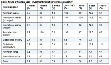 1Source: Bloomberg, AMP Capital, as at 30 June 2018; Australian shares: S&P ASX 200 Accumulation (AUD); International shares (unhedged): MSCI World ex AU Accumulation (AUD); International shares (hedged): MSCI World ex AU Accumulation Hedged AUD; Australian listed property: S&P ASX 200 A-REIT Accumulation; Global listed property (hedged): FTSE EPRA/NAREIT Developed Rental Hedged AUD; Global listed infrastructure (hedged): Dow Jones Brookfield Global Infrastructure Net Accumulation Index Hedged (AUD); Australian bonds: Bloomberg AusBond Composite 0+ Yr Index; International bonds (hedged): Barclays Global Aggregate Index Hedged AUD; Cash: Bloomberg AusBond Bank Bill Index.