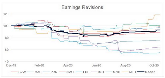 While the macro side was very shaky for a few months through the COVID-19 pandemic, we believe it has actually become even more positive given Chinese stimulus and record low interest rates, leading to even higher gold and iron ore prices. Despite some COVID-19 hiccups on the operating side, most mining services companies have sailed through in reasonable shape with the median earnings revision this year for the group down 7%, considerably less than the ~20% fall seen by the broader small cap market.
