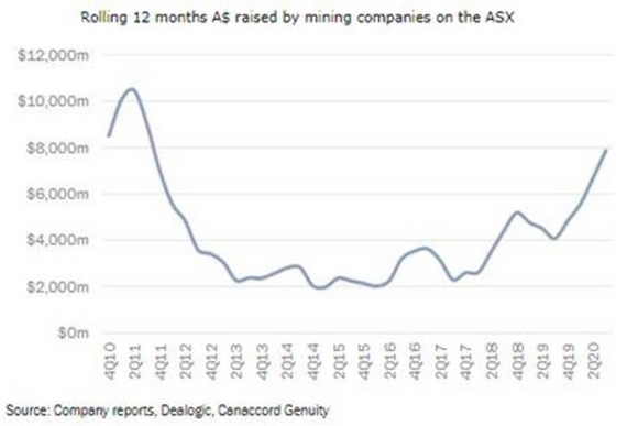 The boom in capital raisings seen over the past six months on the ASX has extended to the junior mining space, with the chart below showing fresh equity raised is up almost 4x from the bottom of the cycle in 2015, and approaching the top of the market in early 2011. We believe this is a good sign for future exploration programs, and coupled with a high gold price (gold typically makes up around 50% of global exploration spend), should set up a good period for companies providing services to the exploration industry, including drillers, tool providers and assay labs.