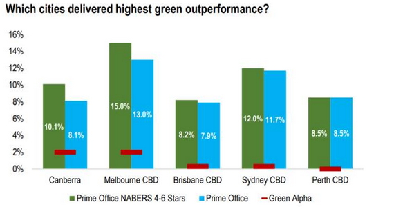 Looking at a cities level, investors chasing green returns might do well to focus on the Melbourne market, which had the highest total returns for prime office buildings with a 4-6 star NABERS rating at 15% in the year to June 2019.