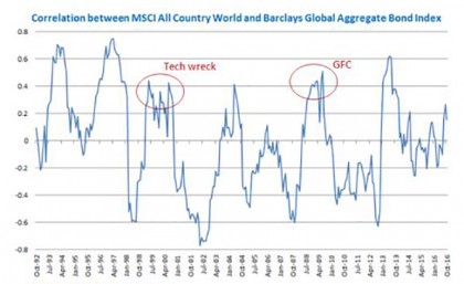 Unfortunately, as you can see in the chart below, two big market events in recent memory – the 2000 tech wreck and the 2008 global financial crisis (GFC) – highlighted the limitations of diversification. Bonds were meant to provide a ballast against falling equities. But just when we needed protection the most, both fell at the same time (positive correlation).