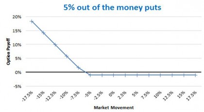 The put contract illustrated in the chart above has a strike 5 per cent below the market level. If the market falls 10 per cent, you will get a 6 per cent return. The premium is 1.5 per cent. If the market goes up or falls less than 5 per cent, the option will expire worthless and you lose the premium.