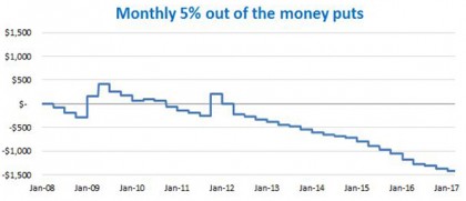 In the chart above, you can see the impact on a notional $10,000 of rolling put options at 5 per cent below the money on the S&P500 in the US. There were positive payoffs to the left towards the GFC. But, generally, they are a drag on performance.