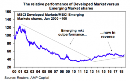 After the Asian/EM crisis (in 1997-98), EM economies implemented various reforms to lift productivity, decrease reliance on foreign capital and float exchange rates which boosted growth in the 2000s. The industrialisation of China at the time and the subsequent surge in commodity prices provided a big boost to underlying EM performance.