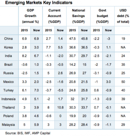 The last emerging market downturn was in 2015 on the back of Chinese growth concerns, a devaluation in the Chinese Yuan and Fed interest rate hike fears. Emerging market economic fundamentals (GDP growth, national savings, current account balances and government budgets) are now in better shape compared to 2015.