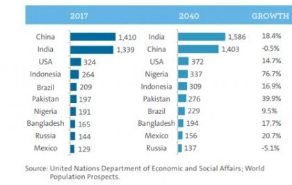 The world population is expected to grow by approximately 1% per year, adding 1.6 billion people over the next 23 years and reaching 9.2 billion by 2040. Most of this growth is expected to occur in African countries, with strong additions also in India, Pakistan, Indonesia, and the United States.
