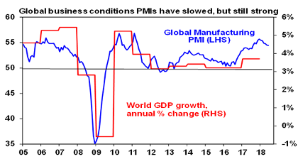 The key things to keep an eye are: global business conditions PMIs for any deeper slowing; risks around a trade war; risks around Trump ahead of the US mid-term elections; the drip feed of Fed rate hikes; conflict with Italy over fiscal policy in Europe; risks around China and emerging countries; and the Australian property market – where a sharp slump in home prices (which is not our view) could threaten Australian growth.
