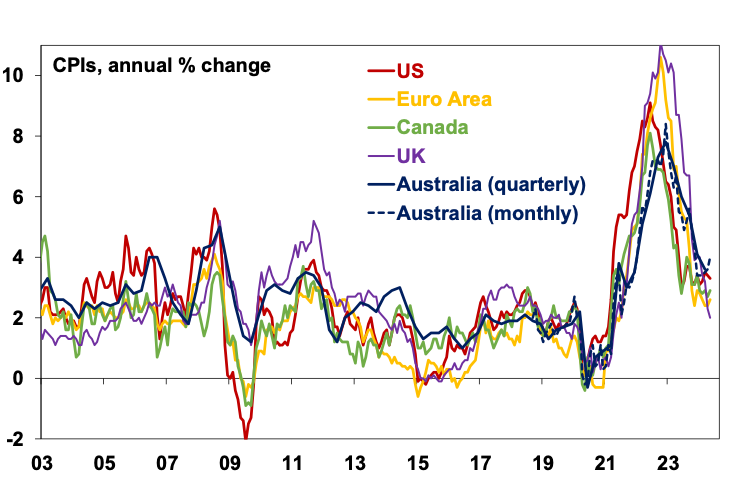 • Australian inflation has also fallen but it’s lagging. This is not necessarily a concern as it lagged global inflation on the way up, peaked later and is lagging on the way down and the situation may be a bit confused by the new and incomplete monthly inflation indicator.