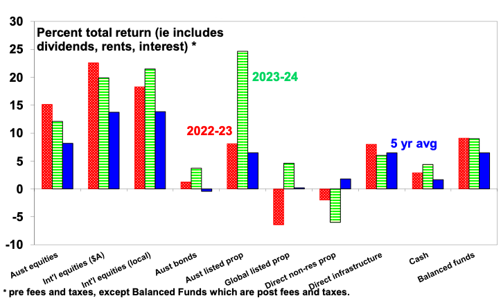 • Global shares returned 21% in local currency terms over 2023-24, with a slight rise in the $A cutting this to a still strong 20% in $A terms. Japanese and US shares outperformed with the US continuing to benefit from the AI boost. Chinese shares fell again.