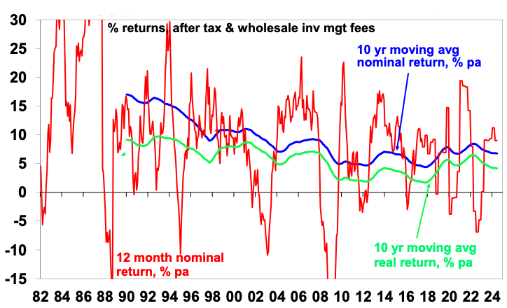 The last few years has seen a zig-zag pattern in returns with average super funds seeing losses in 2019-20, very strong returns in 2020-21, a loss in 2021-22 (as inflation and bond yields surged) and have now had two years of strong returns. Given the volatility it’s best to focus on their longer-term average returns which has been 6.8% pa over the last decade or 4.2% pa after inflation. Which is pretty good as it’s after fees and taxes.