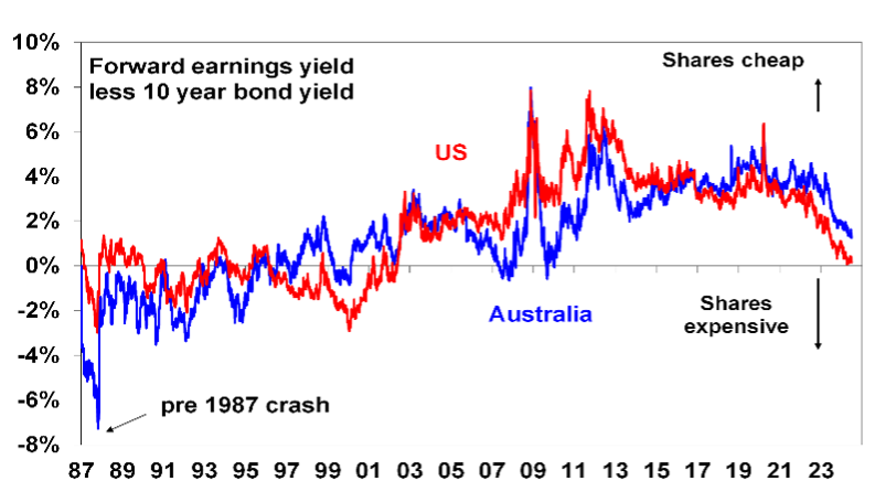 • Shares are offering a low-risk premium over bonds compared to the experience of much of the last two decades, particularly US shares.