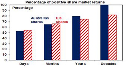 If you look at the daily movements in the share market, they are down almost as much as they are up, with only just over 50% of days seeing positive gains. See the next chart for Australian and US shares. So day by day, it’s pretty much a coin toss as to whether you will get good news or bad news. But if you only look monthly and allow for dividends, the historical experience tells us you will only get bad news around a third of the time. Looking out further on a calendar year basis, data back to 1900 indicates the probability of bad news in the form of a loss slides to just 20% in Australian shares and 26% for US shares. And if you go all the way out to once a decade, since 1900 positive returns have been seen 100% of the time for Australian shares and 82% for US shares.