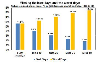 Without a tried and tested asset allocation process, trying to time the market, ie selling in anticipation of falls and buying in anticipation of gains, is very difficult. A good way to demonstrate this is with a comparison of returns if an investor is fully invested in shares versus missing out on the best (or worst) days. The next chart shows that if you were fully invested in Australian shares from January 1995, you would have returned 11.3% per annum (including dividends but not allowing for franking credits, tax and fees).
