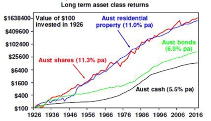 Chart #1 in the first edition in this Five Charts series highlighted the power of compound interest, with a comparison showing the value of $1 invested in various Australian asset classes back in 1900 and what it would be worth today. Unfortunately, I do not have monthly data for Australian residential property returns back that far but I do have them on an annual basis back to 1926 and this is shown in the next chart starting with a $100 investment. (Commercial property return series only really go back a few decades.)