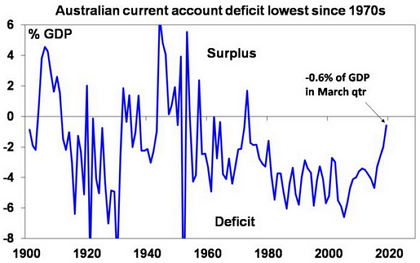 As a share of GDP, it’s the lowest since the 1970s as high iron ore prices have combined with solid growth in export volumes and pushed the trade balance into a record surplus. The current account deficit is the gap between what we spend as a nation and what we earn – so its near disappearance means we are less dependent on foreign capital. This is a big one given that a big scare of the 1980s in Australia was that the large current account deficit and rising foreign debt would lead to a major crisis, collapse the economy and require an IMF bailout. Like with most doomster stories on Australia, we are still waiting!