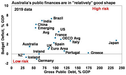 The Federal budget is nearly back in surplus and while we have had a long run of deficits our public finances are in good shape compared to the US, Europe and Japan.