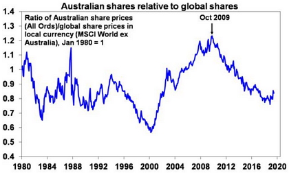 Which brings us to the strong Australian share market. Much of the recent surge in the Australian share market reflects strong gains in mining stocks on the back of the strong iron ore price, strong demand for high yielding stocks as bond yields have plunged and the post-election bounce. And if global shares have a further setback on the back of trade fears then Australian shares will be impacted too. But it’s also worth noting that the Australian share price index has underperformed global share markets for almost a decade now reflecting tighter monetary policy from October 2009, the surge in the $A into 2011, the end of the commodity price boom, worries about a property crash and a mean reversion after Australia’s 2000 to 2009 outperformance. Many of these factors have run their course, have reversed or have been factored in by the share market so maybe the decade-long underperformance by Australian shares is coming close to an end.
