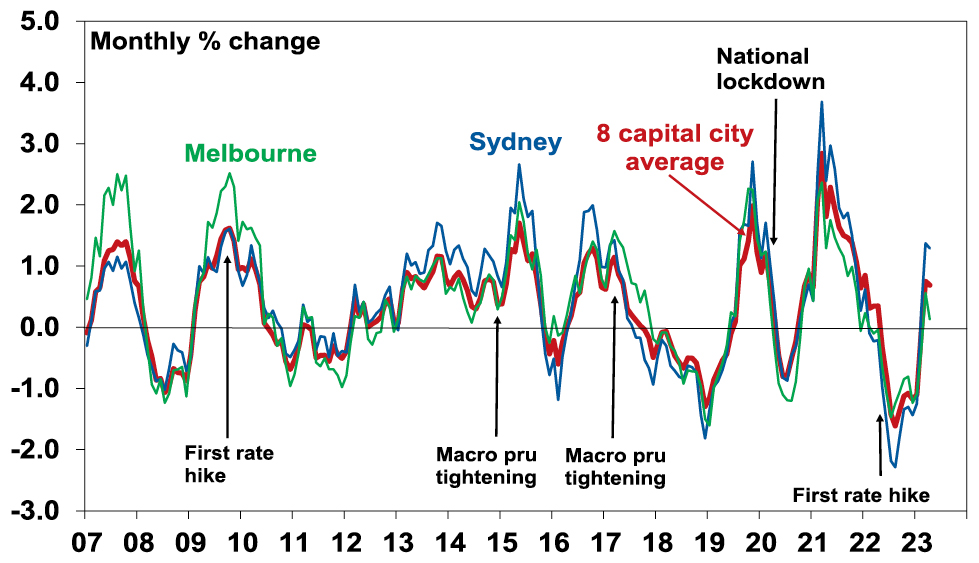 The combination of surging underlying demand driven by immigration, tight supply, low listings and home buyers motivated by expectations rates may be peaking & the historical record showing prices rebounding quickly after falls, tight rental markets and a fear of missing out appear to be dominating the drag from high interest rates and the slowdown in the economy. As such, our forecast for a top to bottom fall of 15-20% out to late this year is looking too pessimistic and we have revised our national average home price forecast for this year from a fall of 7% to flat to up slightly & expect roughly 5% growth next year. This assumes the RBA cuts rates through next year and the economy has a soft landing.