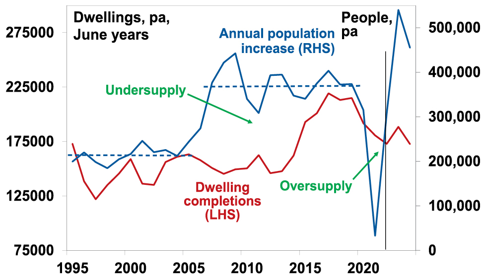 This has occurred against the background of a decline in average household size to less than 2.5 people per dwelling through the pandemic, which the RBA estimates has added around 120,000 households to underlying dwelling demand. This largely offset the negative impact on demand from the hit to immigration through the pandemic lockdown. It could reverse again with rising housing costs but so far this is unknown.