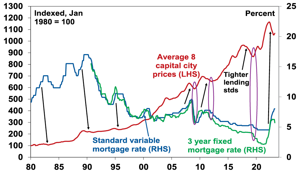 The first point to note is that this property cycle has been a bit unusual. Normally it’s taken several interest rate hikes to knock property prices down because it takes time to cool demand, for unemployment to rise and for distressed sales to increase. However, in this cycle property prices started to fall immediately when rates started to go up and at a time when the underlying property demand/supply situation was tightening. And the last three property price upswings (from 2009, 2012 and 2019) required an easing in monetary policy to get underway (see the ovals in the next chart).