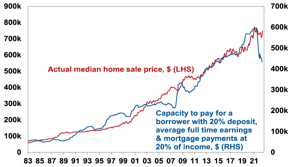 Given the resurgence in underlying demand on the back of very high immigration levels and constrained supply we have revised up our home price forecasts – which is not something I feel entirely comfortable with (given the risks from higher interest rates) or like (given horrible housing affordability). Our base case is now for flat to slightly up prices this year followed by a 5% rise next year. Sydney (benefitting from the surge in immigration) and Perth (with better affordability) are likely to lead the way. However, the headwinds of higher interest rates and poor affordability will likely constrain the upswing at the very least but also mean there remains a still very high risk (which I would put at 45%) of another down leg as rate hikes fully impact and unemployment starts to rise. The conflicting forces of higher rates and a slowing economy, but a chronic demand/supply imbalance make the property market very hard to read with greater than normal uncertainty. Interest rates, unemployment and auction clearance rates are key indicators to watch.