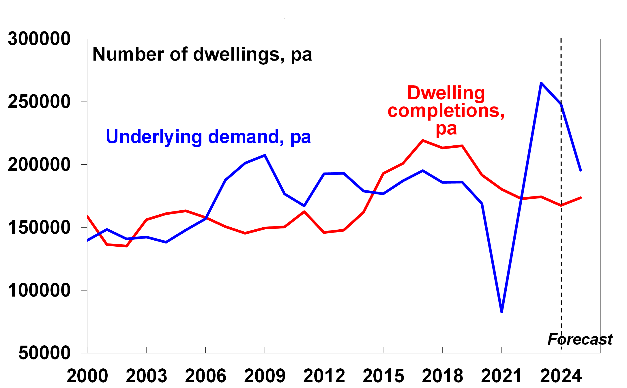 So underlying demand for housing (the blue line in the next chart) has been very high over the last two years relative to housing completions (the red line) resulting in an annual shortfall of around 90,000 dwellings in 2022-23 and another 80,000 dwellings this financial year (ie, the gap between the blue and red lines).