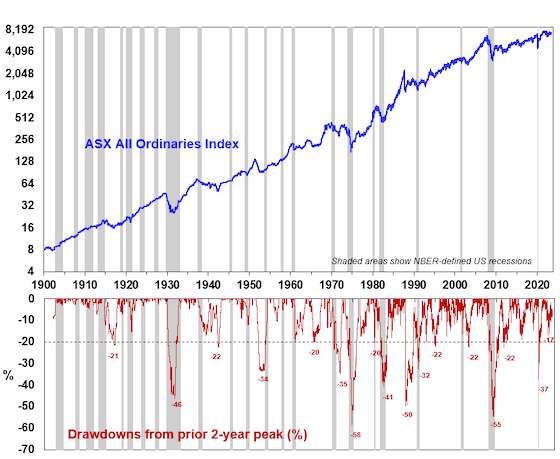 Historically recessions in Australia and the US have tended to be associated with bear markets in shares, ie, 20% or more falls, as recessions drive a slump in company profits. The next chart shows the Australian share market and falls in it against US recessions. A modifying factor is that share markets are still 8% or so down from their 2021/early 2022 highs so the risk of recession is arguably partly still factored into markets which may limit the extent of falls if a recession does eventuate.