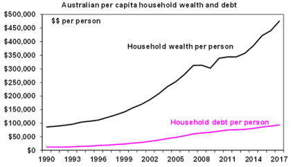 So, while the average level of household debt for each man, woman and child in Australia has increased from $11,837 in 1990 to $93,943 now, this has been swamped by an increase in average wealth per person from $86,376 to $475,569.