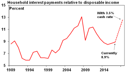 Higher interest rates – the rise in debt means moves in interest rates are three times as potent compared to say 25 years ago. Just a 2% rise in interest rates will take interest payments as a share of household income back to where they were just prior to the GFC (and which led to a fall in consumer spending). However, the RBA is well aware of the rise in sensitivities flowing from higher debt and so knows that when the time comes to eventually start raising rates (maybe later this year) it simply won’t have to raise rates anywhere near as much as in the past to have a given impact in say controlling spending and inflation. And so, it’s likely to be very cautious in raising rates (and is very unlikely to need to raise rates by anything like 2%.)