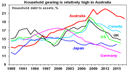 If Australia has an Achille’s heal it’s the high and still rising level of household debt that has gone hand in hand with the surge in house prices relative to incomes. Whereas several comparable countries have seen their household debt to income ratios pull back a bit since the Global Financial Crisis (GFC), this has not been the case in Australia. Some worry Australians are unsustainably stretched, and it is only a matter of time before it blows up, bringing the economy down at the same time. Particularly now that global interest rates are starting to rise. This note looks at the main issues.