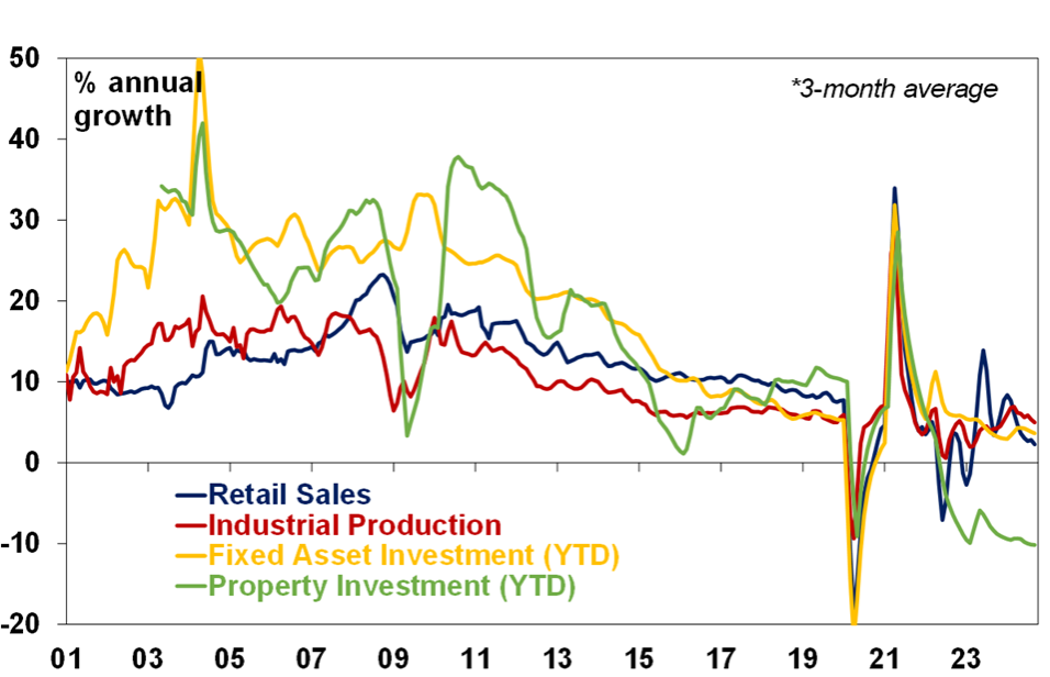 The pivot towards aggressive stimulus looks to have been driven by increasing concern about China’s economic outlook. Chinese growth bounced after its Covid restrictions were eased late in 2022. But the bounce was short-lived, and growth has remained weak by Chinese standards ever since slowing to around 4.5%yoy – with poor growth in retail sales, investment and imports and annual credit growth falling to a record low.