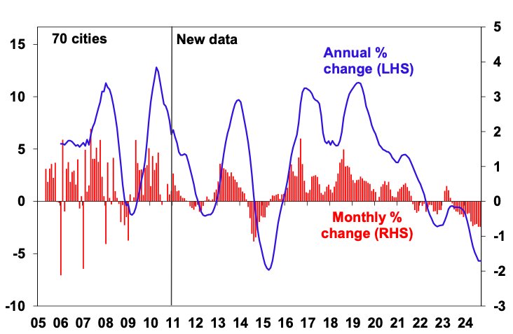 - The ongoing property collapse – home prices have been steadily sliding and property sales have slumped (down 25% year to date) reflecting an oversupply. This has led to big problems at: developers (eg, Evergrande and Country Garden); local governments that rely on land sales for revenue; and households who have seen property related investments sour. Property investment has also collapsed.