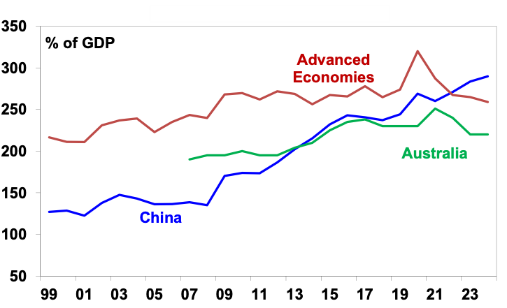- Excessive savings – China has a very high total saving rate of around 45% of GDP, roughly double Australia’s. This makes China’s debt problems very different to other countries as China has borrowed from itself. But it means the savings have to be recycled (usually via debt) into demand or else high unemployment and chronic deflation can result. China did this for many years through corporate borrowing for investment focussed on driving exports and then into property which has resulted in a rapid rise in China’s debt levels. China’s non-financial debt to GDP ratio is now above the advanced economy average and Australia.