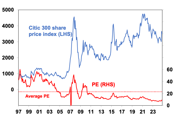For investors, the move by China towards more aggressive policy stimulus should help the global economy avoid recession and along with central banks lowering interest rates is positive for shares on a 6-12 month horizon. It may not be enough to reverse the Australian share market’s relative underperformance, but it may help reduce it.