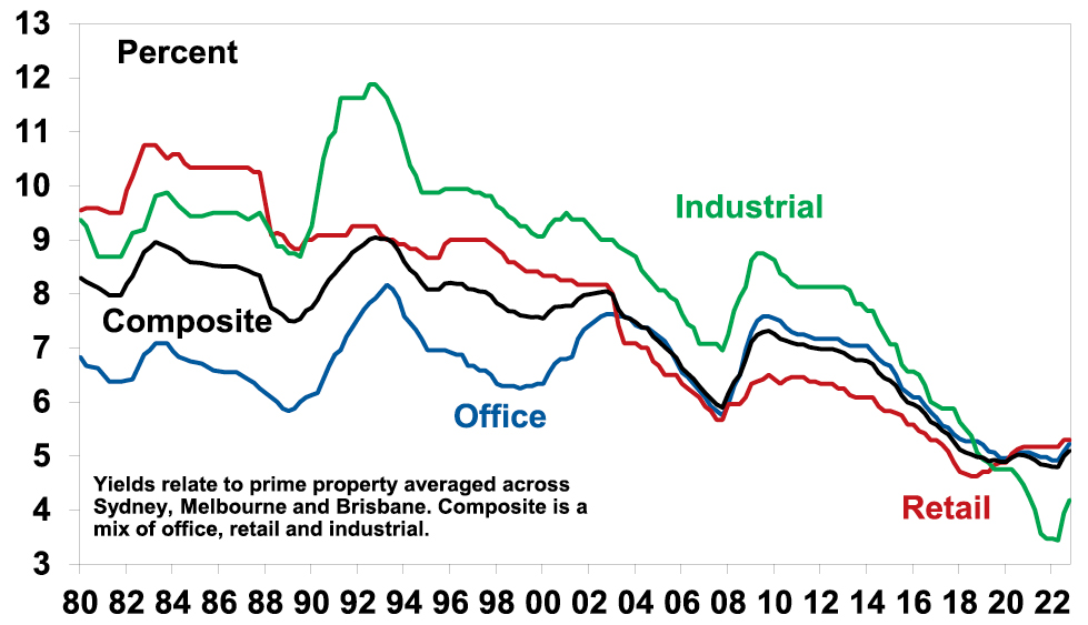 Leasing conditions typically deteriorate when the economic cycle turns down as companies lay off workers & cut hiring, retail spending slows and economic activity slows generally impacting industrial property. This time around it could be made worse by structural considerations in the case of retail and particularly office property. Retail property has been adjusting for years to the rising proportion of activity which is transacted online. The share of retail sales online has gone from around 7% pre-pandemic to around 11% now and this is acting to constrain retail space demand and rents. While there has been a return to the office post the pandemic lockdowns, many office employees are averaging two days a week in the office with Mondays and Fridays often near deserted. There are huge benefits to working together physically around culture, collaboration, idea generation and learning from others but there are also benefits to working from home in terms of no wasted commute time, more focussed work, less damage to the environment, better family flexibility and life balance. Once the pandemic revealed these benefits, they can’t then be unseen. And cost focussed companies with hot desking, laptops and work anywhere IT have pushed their staff in that direction anyway. The ideal for most is probably somewhere in between the extremes at say 2-3 days a week in the office but a return to the pre-pandemic norm of 4-5 days is most unlikely. This means that many companies will likely give up space when their leases expire, as they accept that balanced work from home is here to stay and they use it as a way to save rental costs. Over time this could mean a 30-40% reduction in leased office space demand. Average Australian capital city office vacancy rates are at 15% – their highest since the mid-1990s. But because this measures leased space, significant upside is possible if companies bite the bullet and cut leasing requirements. And rising vacancy rates mean lower office rents and falling values.