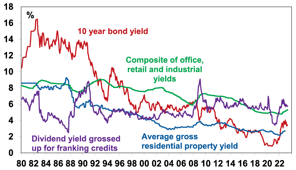 Of course, while the decline in yields since the 1980s was big, unlisted non-residential property was not alone. In fact, while the grossed-up dividend yield from shares has been range bound over the last 40 years, yields on bonds, residential property and listed property have fallen more than unlisted commercial property yields. See the next chart. 10-year bond yields have fallen from well above commercial property yields in the 1980s to well below. And in the 1980s the rental yield on residential and commercial property was similar, but today the former is far lower.