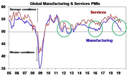 This decade has now seen three global growth scares – around 2011-12, 2015-16 and now since last year. Each have been associated with softening business conditions indicators (or PMIs) as indicated in the next chart – see the circled areas.